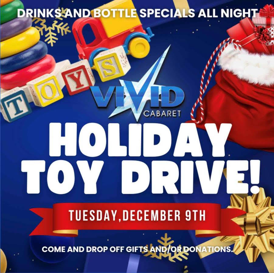 Toys (unwrapped, please) can be dropped off at the club through December 9th, when the mighty U.S. Marines will visit Vivid Cabaret to pick them up for their “Toys for Tots” program.