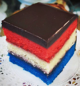 Just in: Chef Jayson Margulies has created a delicious red, white, and blue cake with chocolate topping as a special dessert treat for Fleet Week.