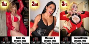 Vicky Vette is happy to announce that superstar Sara Jay has been voted Most Popular Cam Star of the Month of October 2025 as voted by the fans of VNALive.com.  Exotic MILF Maxine X and Canadian webcam starlet Daisy Destin won 2nd and 3rd respectively. This is Sara Jay’s first win of 2025!